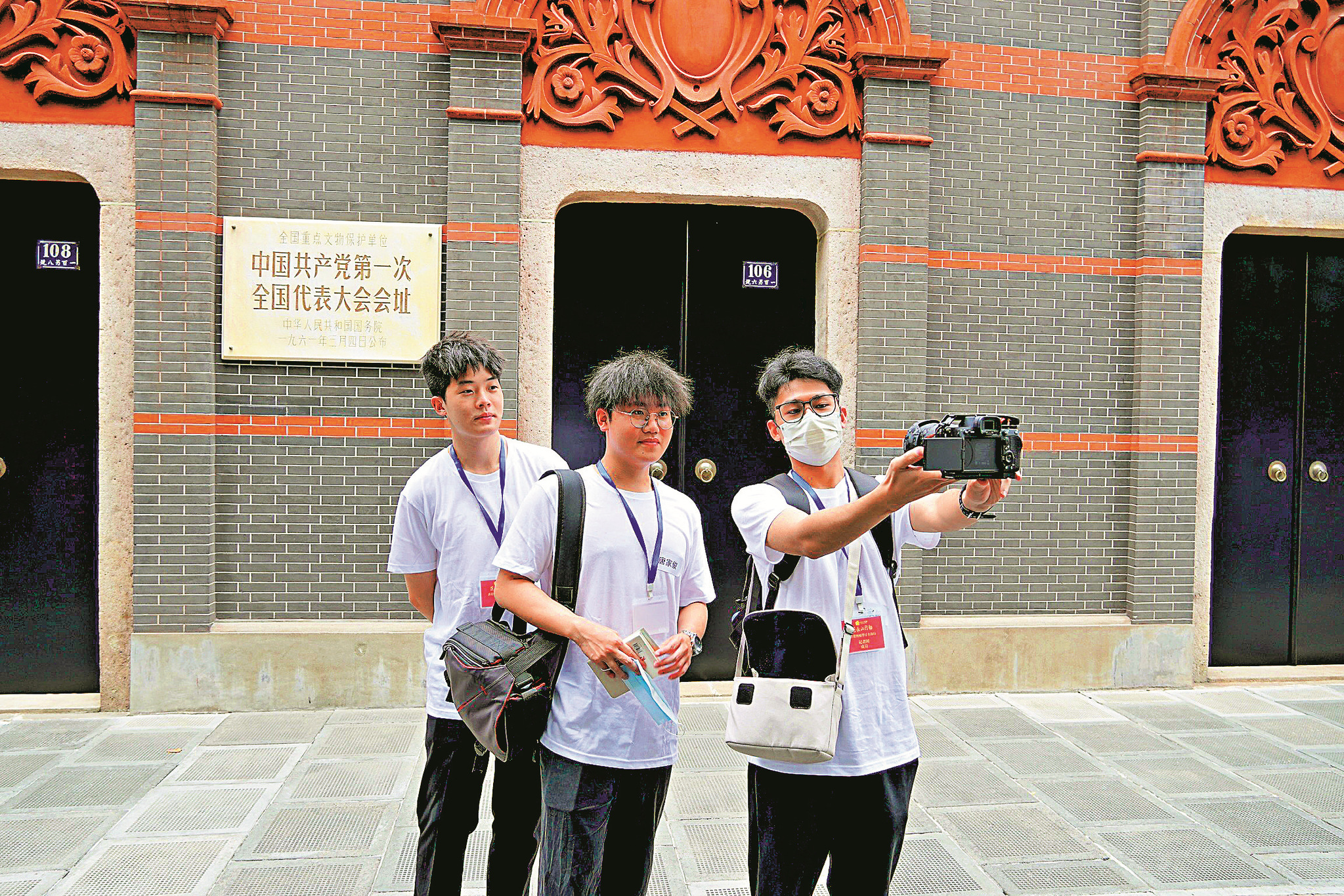 在採訪中,有同學表示自己由於太過興奮,抵達上海首日晚上失眠到凌晨,腦子裏還在考慮如何採訪好次日的活動。在一大紀念館,一個多小時的參觀中,大家紛紛拿出自備的相機、攝影機等,留下珍貴的瞬間。高溫、酷熱下採訪體力消耗極大,但是到了吃飯時,還有不少男生顧不得滿枱的食物,擦一擦汗水,就聚到旁邊的桌子上,拿出電腦和手機,開始商量稿件和版面安排問題。同學們還表示,疫情以來,有這樣的採訪和實踐機會實在難得,必須好好珍惜。希望短短幾天,能夠貢獻出多一點精彩的版面。