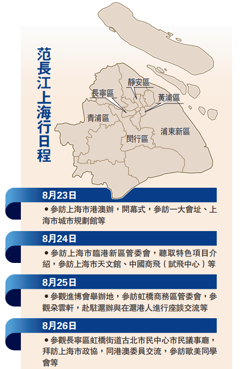 本次范長江行動分為幾個板塊。首先通過參觀一大會址和展館,實地了解中國共產黨的「來時路」;其次通過參觀自貿區臨港新片區、虹橋商務區、進博會,以及上海商飛等地,感受上海始終不斷向上的活力。最後,通過探訪舊區改造、市民中心等地,了解上海在城市治理上的「繡花功夫」。活動還特別安排了港生與在滬港人互動活動。