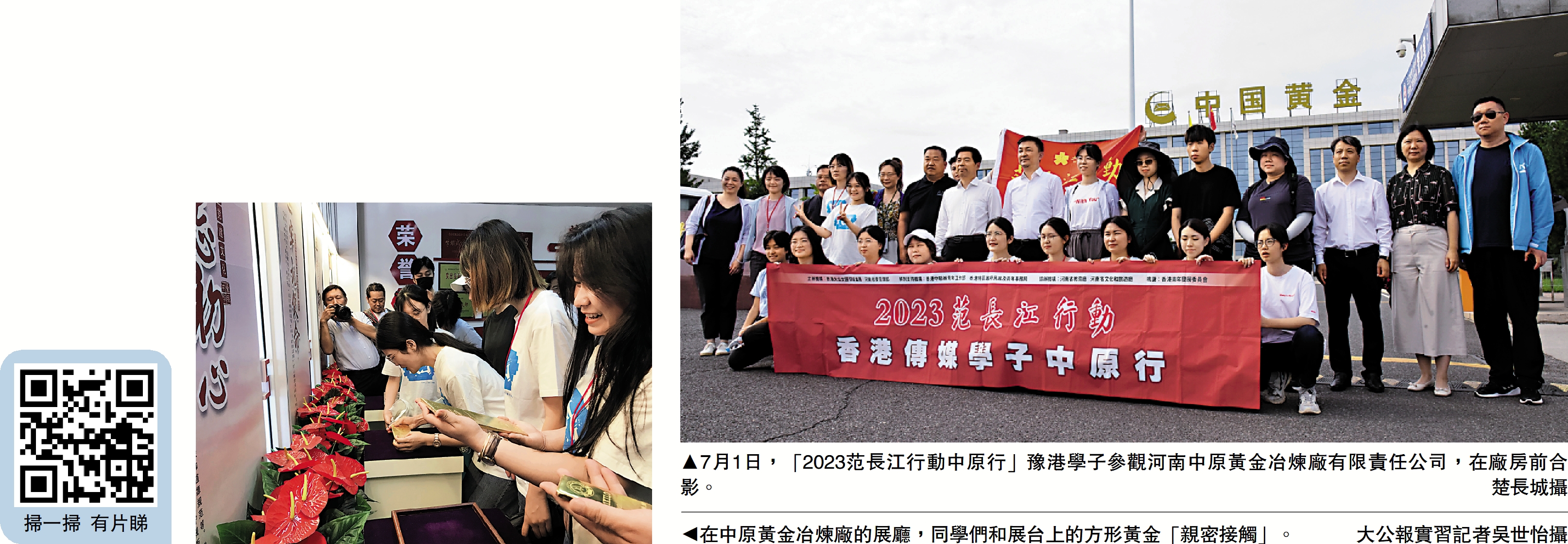 (大公報實習記者 範佳琦 徐春敏 吳世怡 林浩星 林惠欣 朱洵可 牛斌花 薛心壹 肖峰輝 朱璐璐三門峽報道)黃河九曲十八彎,流經河南三門峽,讓這裏成為「生態明珠、天鵝之城」。7月1日,「2023范長江行動中原行」的豫港兩地學子參觀位於河南三門峽市的河南中原黃金冶煉廠有限責任公司以及寶武鋁業科技有限公司,通過參觀生產車間、親手觸摸金屬成品,了解企業的前沿技術,同學們感受到冶金企業「專精特新」的發展理念。而在實現產能的高效提升和技術的精益求精之時,作為「工業重鎮」的三門峽也不斷開拓創新,探索可持續的環保生產技術,「既要金山銀山,也要綠水青山」,共譜城市發展之歌。