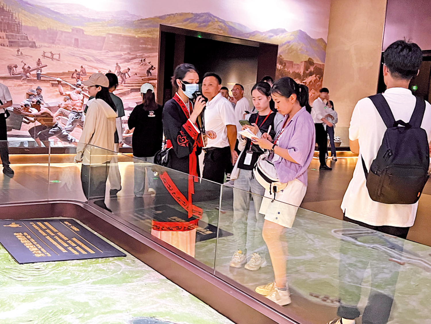 「這個布景好震撼!」走進展覽廳,看到海昏侯墓建造場景的實景還原,贛港學子讚嘆不絕。為了讓遊客擁有「身臨其境」的沉浸式觀展體驗,海昏侯國遺址博物館根據漢代歷史資料的記載和考古挖掘發現,用人物蠟像和沙盤模型代替文字描述,更直觀地展現出海昏侯墓建造的不易。同時,博物館充分運用新型數字技術,打破時空阻隔,全方位展示文物及其背後的文化故事。每個展品下方,均設有二維碼以便收聽自動語音講解,即使足不出戶,遊客亦可通過博物館官方網站參觀VR虛擬展覽。