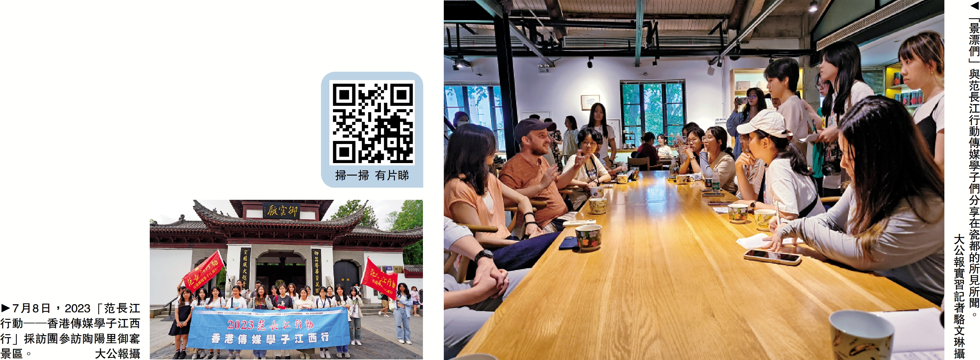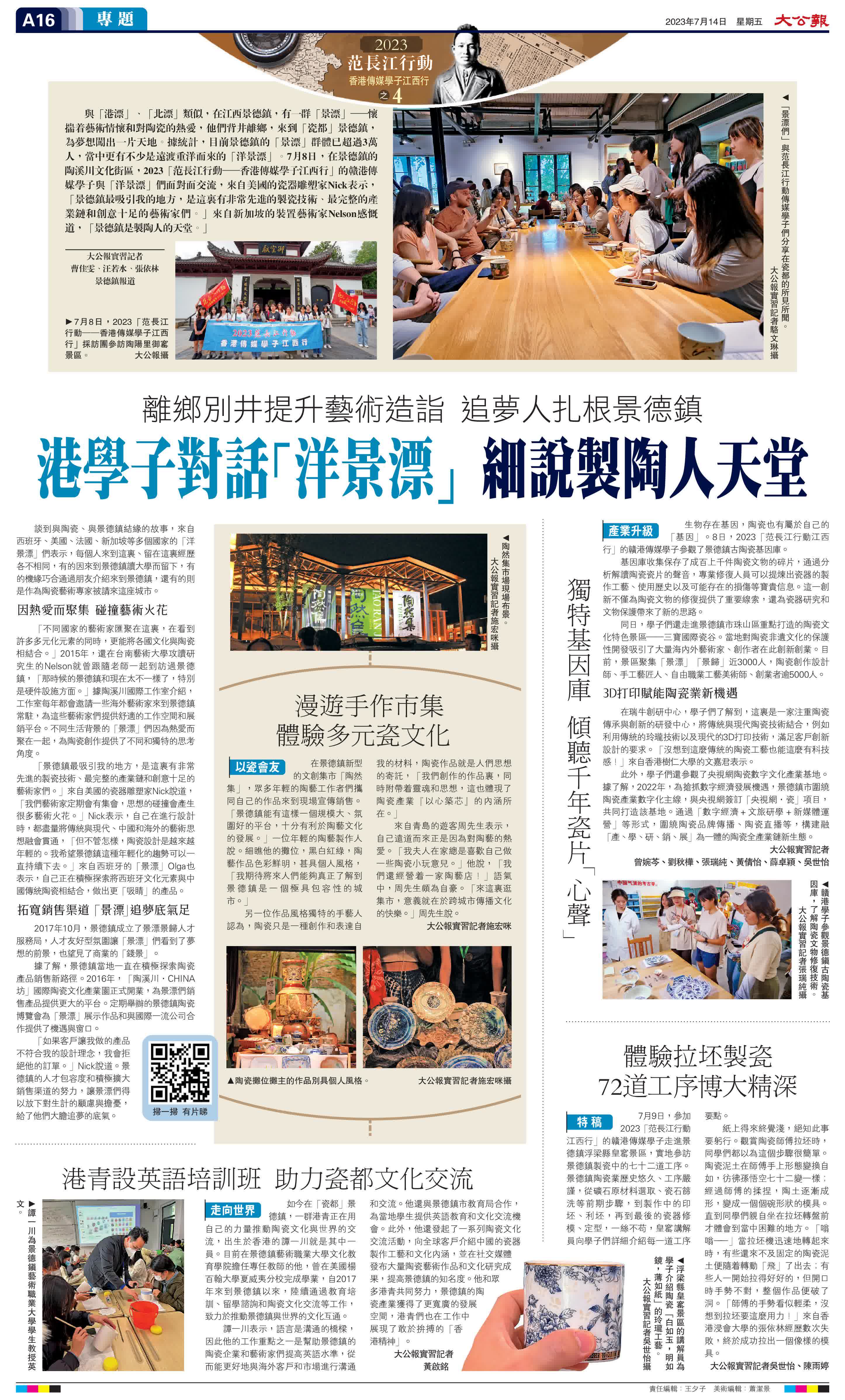 (大公報 實習記者 曹佳雯、汪若水、張依林 景德鎮報道)與「港漂」、「北漂」類似,在江西景德鎮,有一群「景漂」─懷揣着藝術情懷和對陶瓷的熱愛,他們背井離鄉,來到「瓷都」景德鎮,為夢想闖出一片天地。據統計,目前景德鎮的「景漂」群體已超過3萬人,當中更有不少是遠渡重洋而來的「洋景漂」。7月8日,在景德鎮的陶溪川文化街區,2023「范長江行動─香港傳媒學子江西行」的贛港傳媒學子與「洋景漂」們面對面交流,來自美國的瓷器雕塑家Nick表示,「景德鎮最吸引我的地方,是這裏有非常先進的製瓷技術、最完整的產業鏈和創意十足的藝術家們。」來自新加坡的裝置藝術家Nelson感慨道,「景德鎮是製陶人的天堂。」