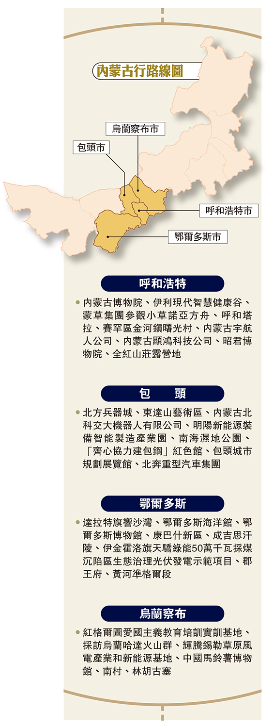採訪團將走訪內蒙古自治區首府「中國乳都」呼和浩特、「一帶一路」重要節點城市「稀土之都」包頭、「溫暖全世界」的「羊絨之都」鄂爾多斯和「中國馬鈴薯之都」、「草原避暑勝地」烏蘭察布。江新輝說,當中既有對機器人企業、光伏企業的參觀,又有對沙漠、黃河生態治理的採訪;既會對內蒙古自治區保障民生經驗做法有所了解,又將親身體驗內蒙古歷史文化保護傳承。