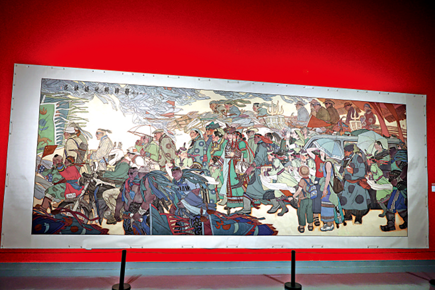 一幅來自中國女畫家要紅宇的作品《走向盛世那達慕》,牢牢抓住了蒙港學子的眼球。據介紹,這幅畫的創作靈感來源於要紅宇在2004年第一次去草原參加「那達慕」時的情景:眾多的人物、車、馬熙熙攘攘地一起向會場走來,場面壯觀。在畫作中下方有三名蒙古族壯漢,身着蒙古族服飾,脖子上還戴着彩帶項圈。
