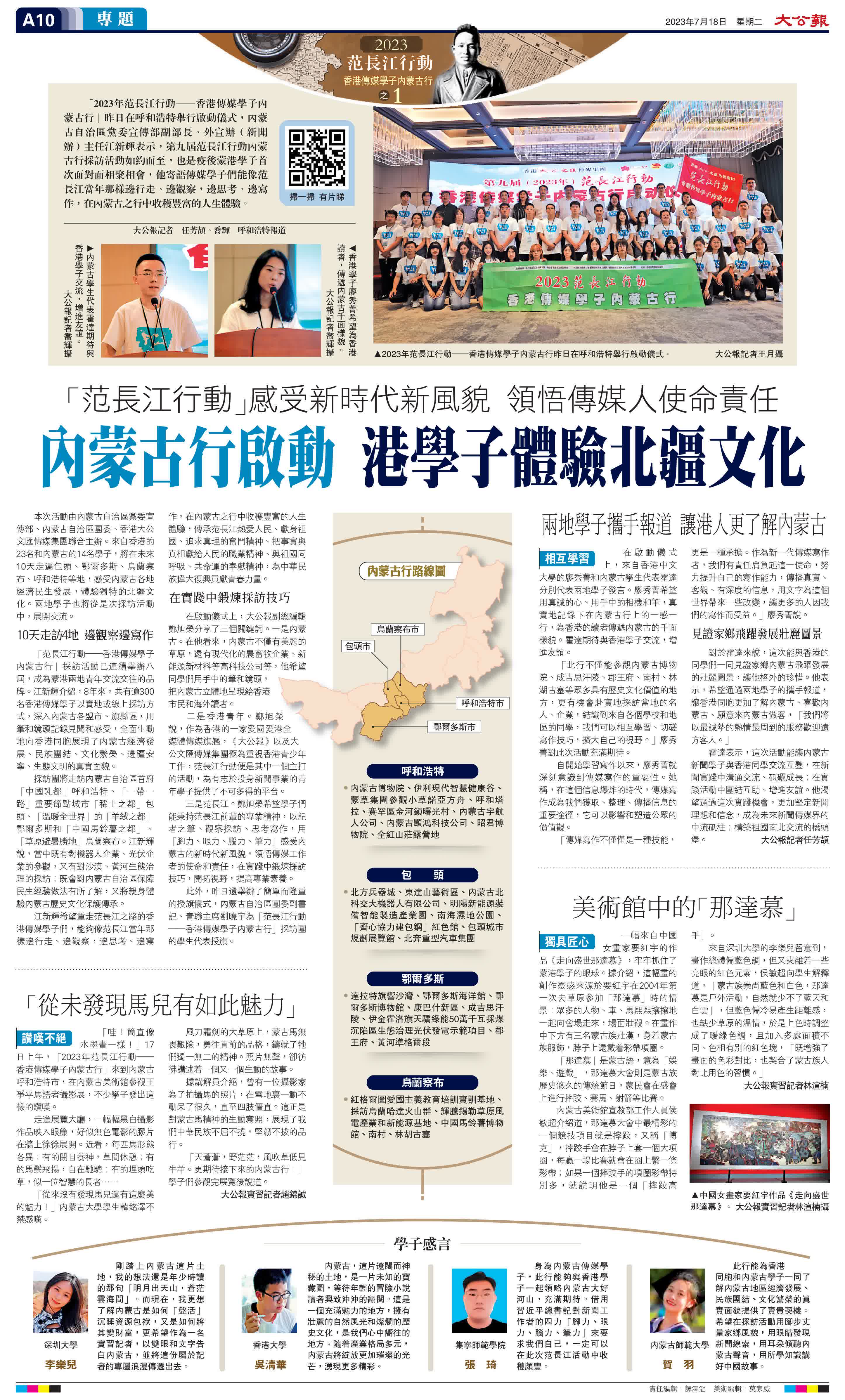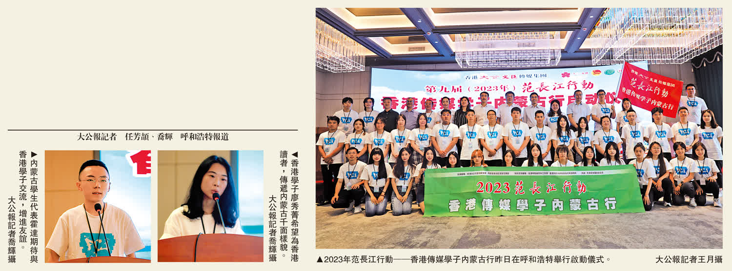 (大公報記者 任芳頡 喬輝 實習記者趙錦誠 實習記者林渲楠 呼和浩特報道)「2023年范長江行動─香港傳媒學子內蒙古行」昨日在呼和浩特舉行啟動儀式,內蒙古自治區黨委宣傳部副部長、外宣辦(新聞辦)主任江新輝表示,第九屆范長江行動內蒙古行採訪活動如約而至,也是疫後蒙港學子首次面對面相聚相會,他寄語傳媒學子們能像范長江當年那樣邊行走、邊觀察,邊思考、邊寫作,在內蒙古之行中收穫豐富的人生體驗。