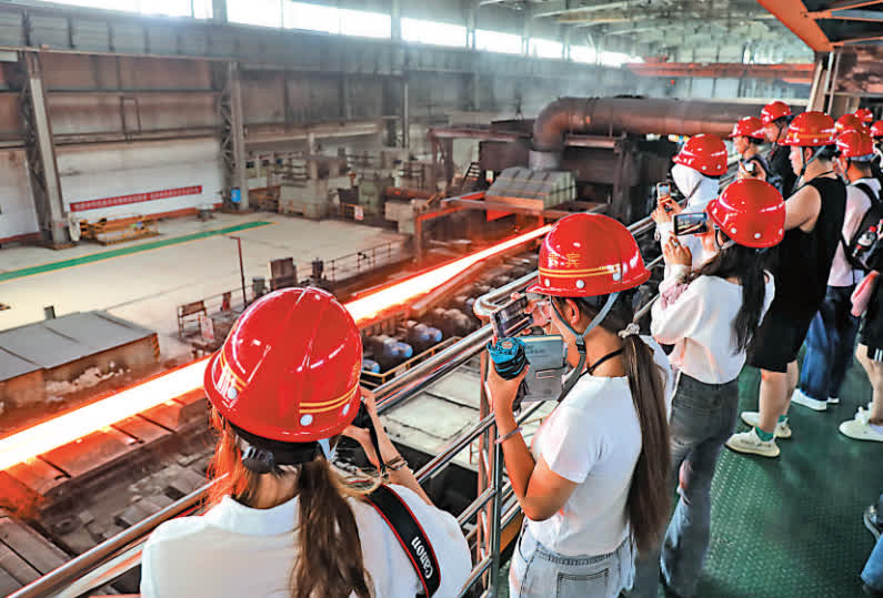 參加2023年范長江行動內蒙古行的香港傳媒學子們走進包鋼軌梁廠,火紅的條形鋼胚在千米長的萬能軋鋼生產線上,反覆軋製,一股熱浪迎面而來,軋機轟鳴,吸引着到訪包鋼軌梁廠的學子駐足觀看。包鋼軌梁廠安全監理富鵬介紹,學子所處的位置距鋼胚直線距離約16米,體感溫度接近40度,鋼胚實際溫度約1350度。「過去工人需要腳踩特製木鞋、身穿石棉服在旁操作機器軋鋼,每天在『桑拿房』工作8小時。」